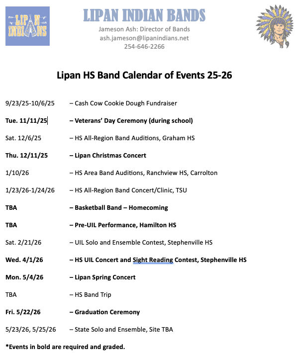 HS Band Calendar of Events
